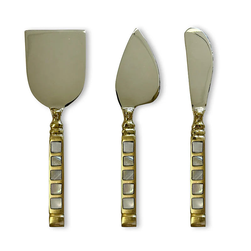 The Eden cheese knife set has a gold handle with Mother of Pearl inlay. It comes packaged in a gift box.