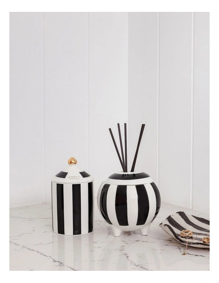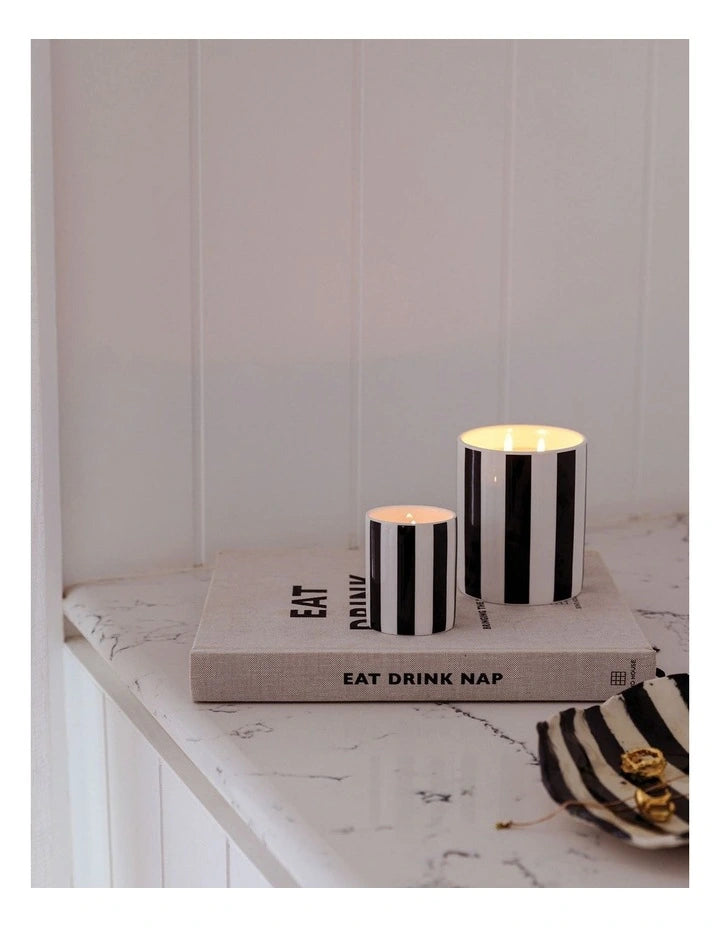 Hand-poured, custom-designed ceramic candle that fills any space with the intoxicating and romantic blend of Jasmine, Amber & Saffron. Featuring bold stripes and luxe foiling, these ceramics are designed to be re-used long after the candle is finished.