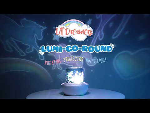 Glowing rotating projector night light with a unicorn theme that has three light settings, three light colours and three brightness modes.